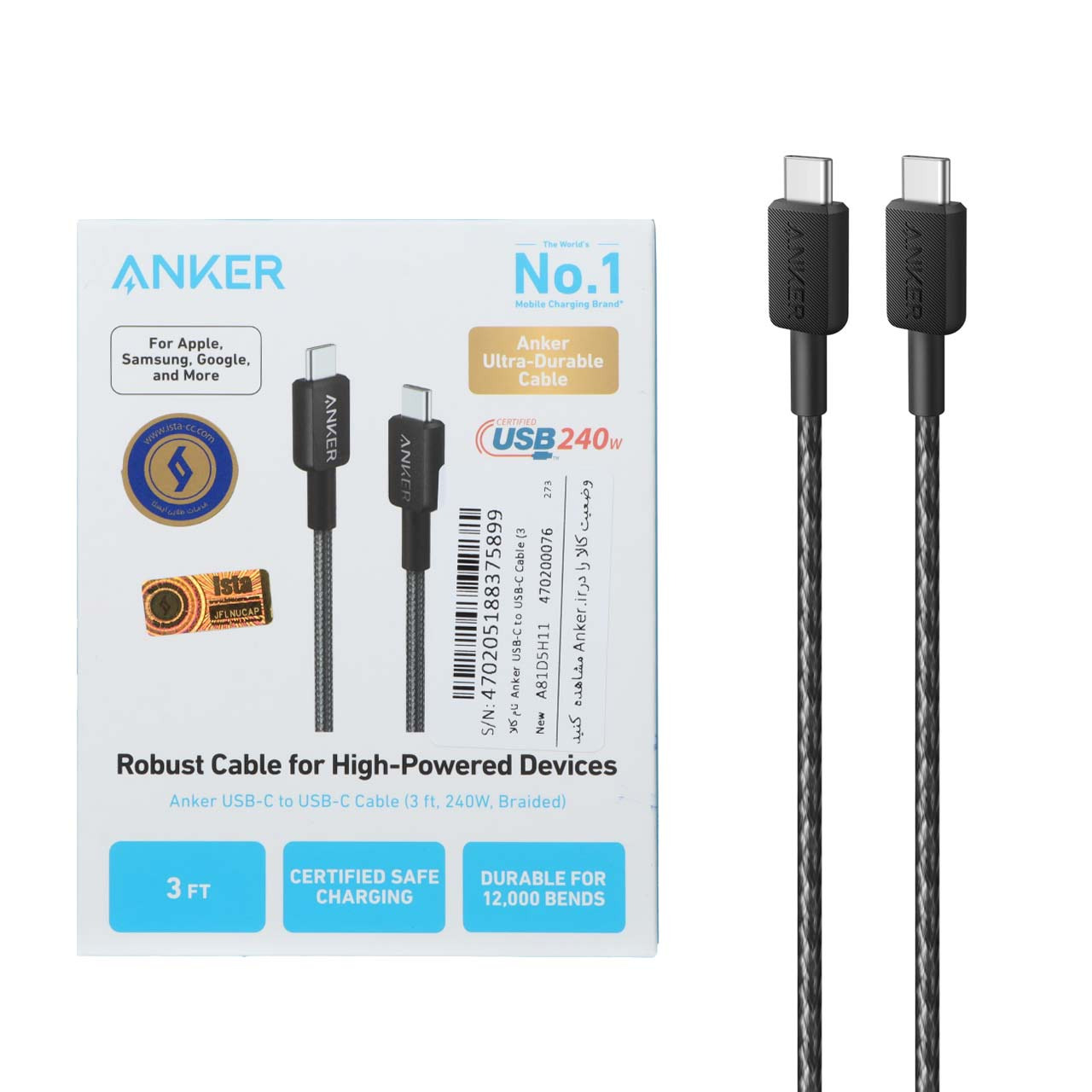 کابل شارژ PD و فست 0.9 متری ANKER Type-C To Type-C مدل A81D5H11 240W - مشکی (گارانتی 18ماهه حافظه طلایی ایستا)
